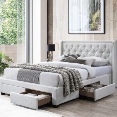 JACKSON QUEEN BED BOUCLE IVORY FABRIC WITH FOUR DRAWERS ENQUIRIES CALL PETER 0435344775