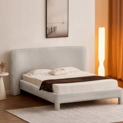 JENNA QUEEN BED FRAME OATMEAL FABRIC SCULPTURED RANGE CALL PETER 0435344775
