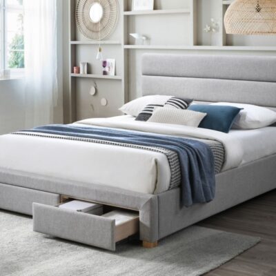 . NEON DOUBLE BED FRAME IN LIGHT GREY FABRIC WITH TWO DRAWERS AND USB – ENQUIRIES CALL PETER 0435344775