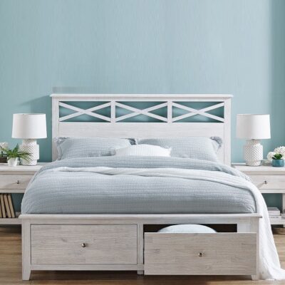 CLIFTON HAMPTON QUEEN BED WITH DRAWERS WHITE WASH TIMBER CALL PETER 0435344775