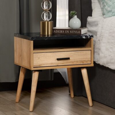 MARCELLO 1 DRAWER 1 SHELF BEDSIDE CHEST TABLE WOTAN OAK – BLACK MARBLED CONTEMPO ENQUIRIES CALL PETER 0435344775