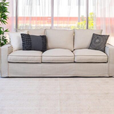 LOGAN FEATHER DOWN SOFT 3 SEATER SOFA STONE FABRIC ENQUIRIES CALL PETER 0435344775