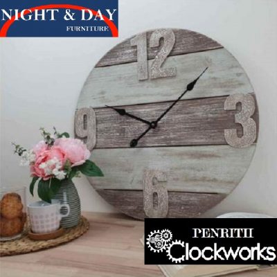 :Wall_clock – 60 cm Timber Autum Timber design 12 hr Clock Grey wash & White