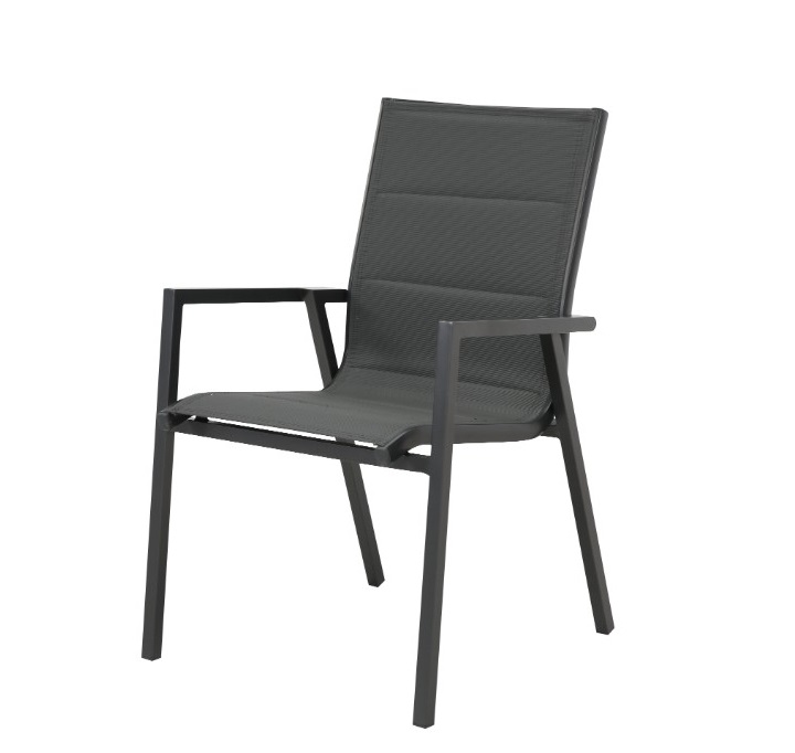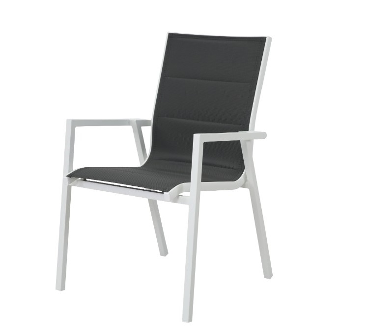 • The dining chairs are padded textilene for added comfort and stack for easy storage