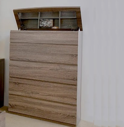- The top of the chest has a unique hide away mirror fitted with gas struts for easy opening and closing and includes separate makeup or jewelry compartments