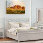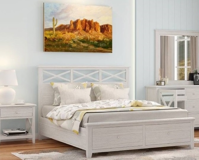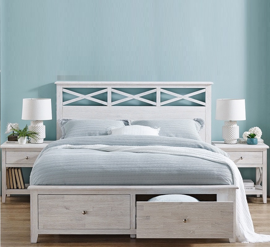 Hampton inspired design with whitewashed hardwood frame, Featuring a very unique panel pattern in the bedhead, the foot is fitted with fully assembled large timber drawers on steel runners and the brawer base is felt lined.