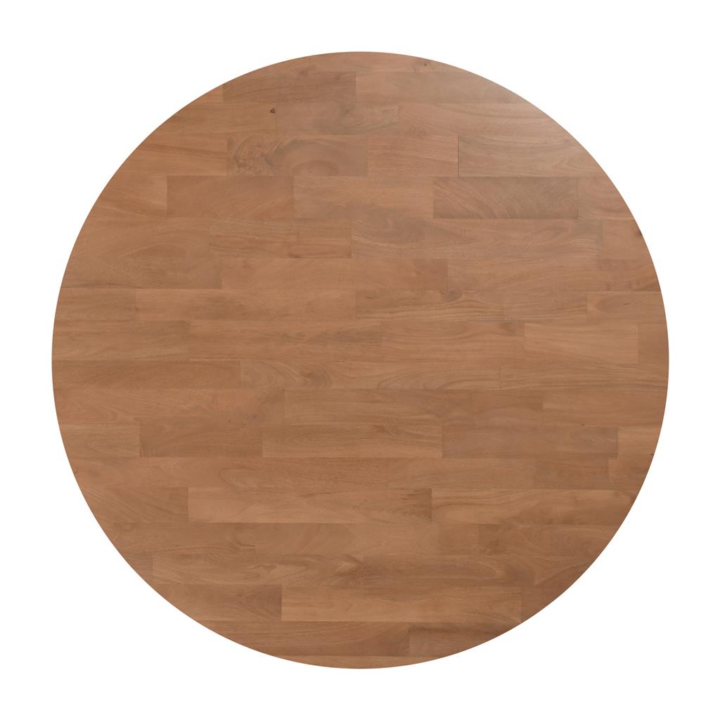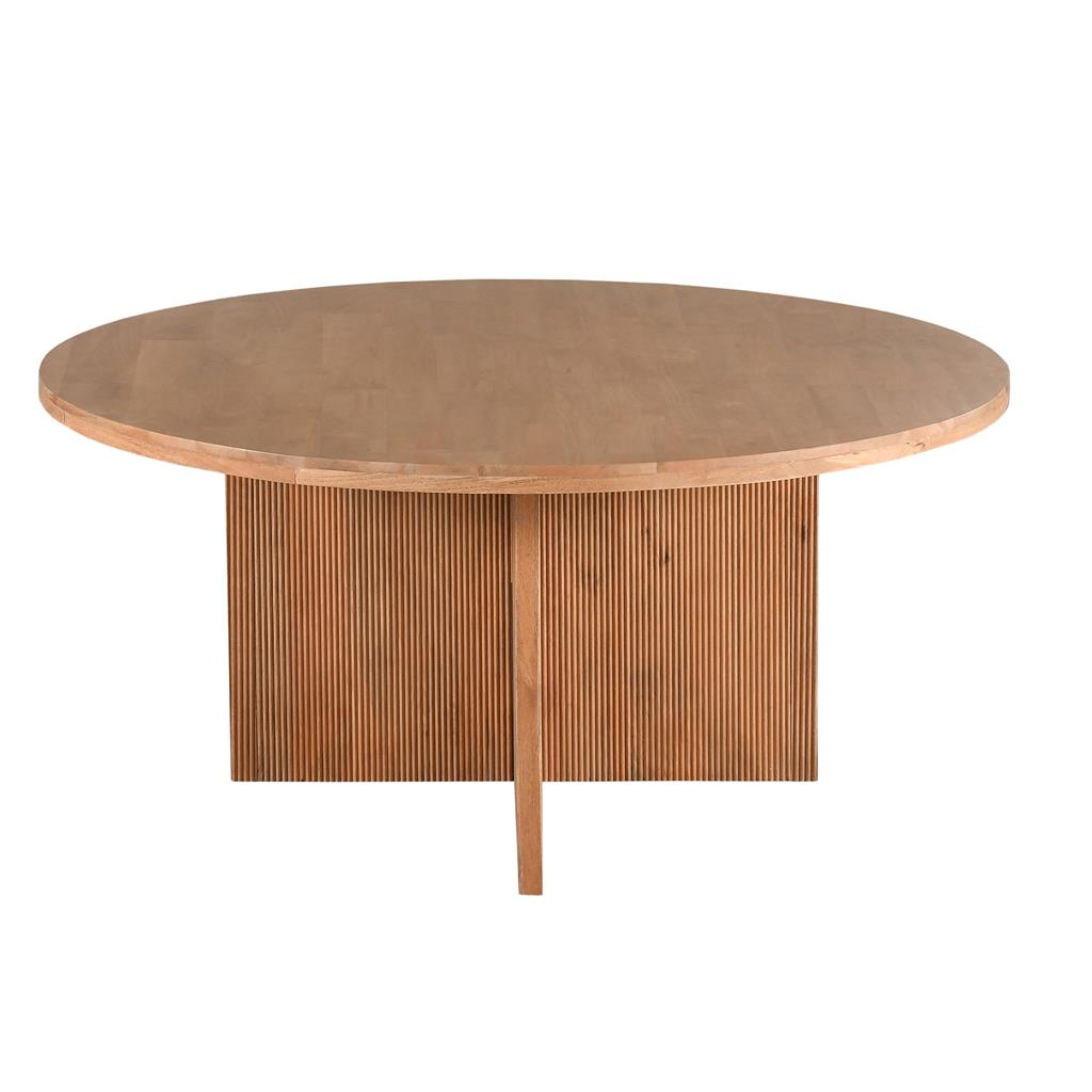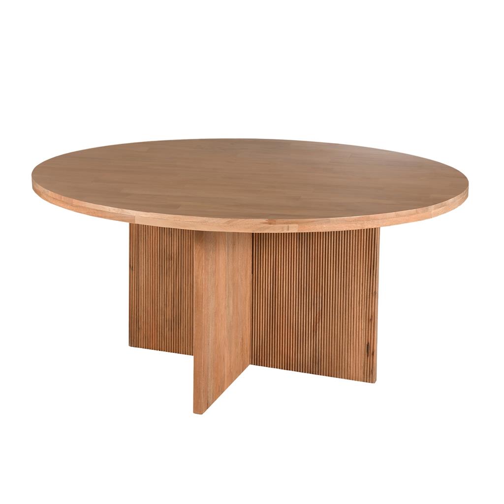 • The Ponderosa round dining table features a warm natural finish and a sculptural cross-leg base with refined fluted detailing, adding texture and modern character to the dining space