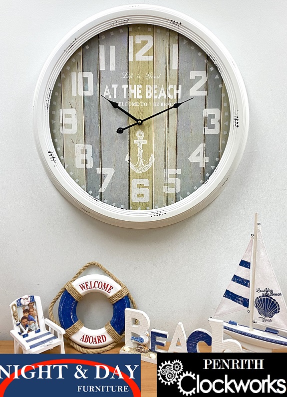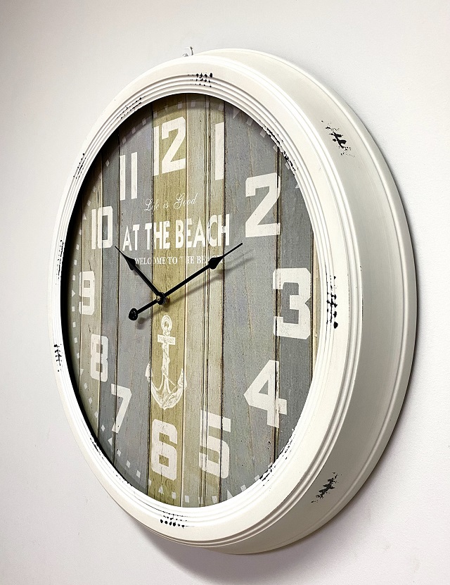 This Beautiful Wall clock – 62 cm Large At the Beach Clock white numbers white Case is an amazing addition to any room in your home , with it’s Antique  Design .This Metal  & timber Wall clock will be a centre piece to your home.
